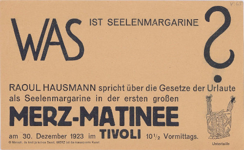 Was ist Seelenmargarine? : Raoul Hausmann spricht über die Gesetze der Urlaute als Seelenmargarine in der ersten grossen Merz-Matinee am 30. Dezember 1923 im Tivoli 10 1/2 Vormittags [Akzidenz]