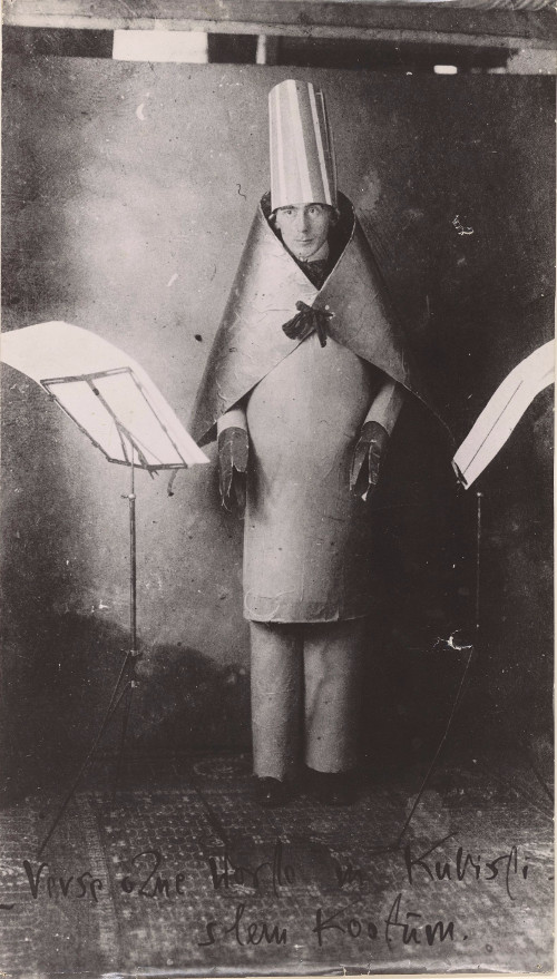 Verse ohne Worte in kubistischem Kostüm [Hugo Ball im Cabaret Voltaire, seine Lautgedichte rezitierend]