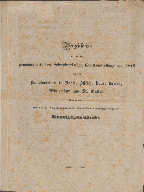 Verzeichnis der bei der gemeinschaftlichen Schweizerische Kunstausstellung von 1846 von den Kunstvereinen in Basel, Zürich, Bern, Luzern, Winterthur und St. Gallen angekauften und den 23. Nov. in Zürich unter sämmtlichen Actionären verloosten Kunstgegenstände