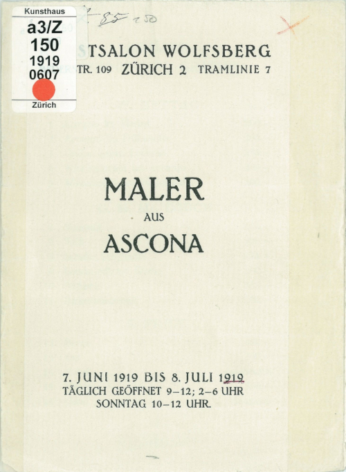 Maler aus Ascona : 7. Juni 1919 bis 8. Juli 1919, täglich geöffnet 9-12; 2-6 Uhr, Sonntag 10-12 Uhr / Kunstsalon Wolfsberg, Bederstr. 109, Zürich 2, Tramlinie 7