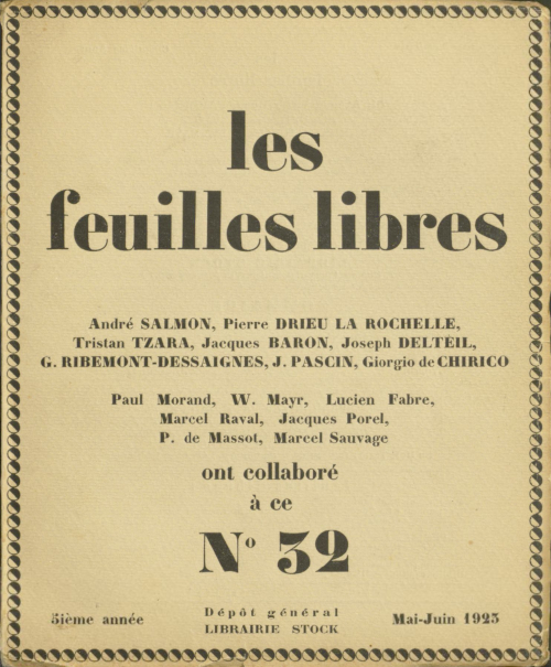 Auf Umschlag: "André Salmon, Pierre Drieu la Rochelle, Tristan Tzara, Jacques Baron, Joseph Delteil, G. Ribemont-Dessaignes, J. Pascin, Giorgio De Chirico, Paul Morand, W. Mayr, Lucien Fabre, Marcel Raval, Jacques Porel, P. de Massot, Marcel Sauvage, ont collaboré à ce No. 32"