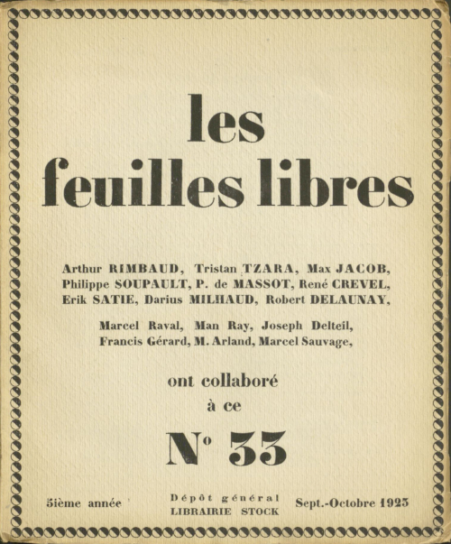 Auf Umschlag: "Arthur Rimbaud, Tristan Tzara, Max Jacob, Philippe Soupault, P. de Massot, René Crevel, Erik Satie, Darius Milhaud, Robert Delaunay, Marcel Raval, Man Ray, Joseph Delteil, Francis Gérard, M. Arland, Marcel Sauvage, ont collaboré à ce No. 33" |