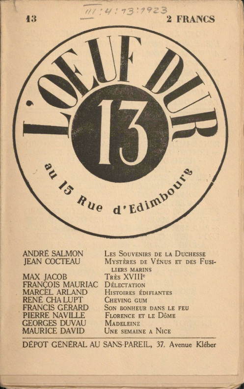 L'oeuf dur : revue mensuelle / André Salmon, Jean Cocteau, Max Jacob, François Mauriac, Marcel Arland, René Chalupt, Francis Gérard, Pierre Naville, Georges Duvau, Maurice David [Zeitschrift] . 13