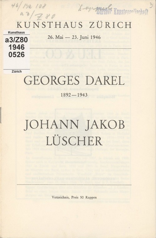 Georges Darel, 1892-1943, Johann Jakob Lüscher : 26. Mai bis 23. Juni 1946 : Verzeichnis / Kunsthaus Zürich
