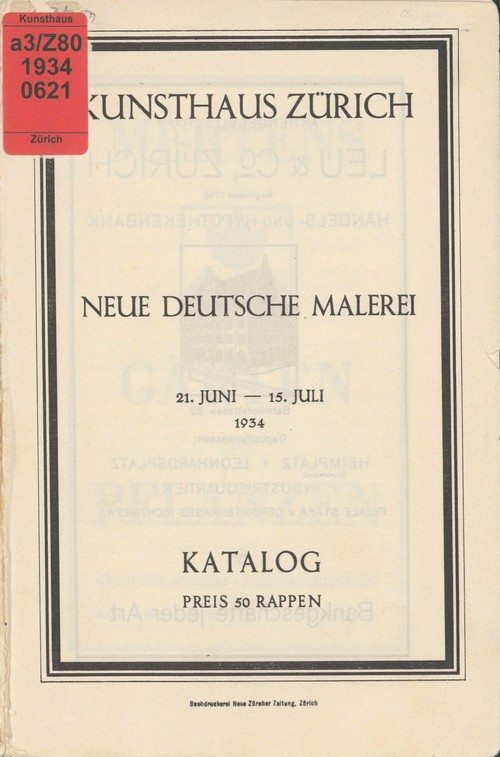 Neue Deutsche Malerei : Kunsthaus Zürich, 21. Juni - 15. Juli 1934 : Katalog