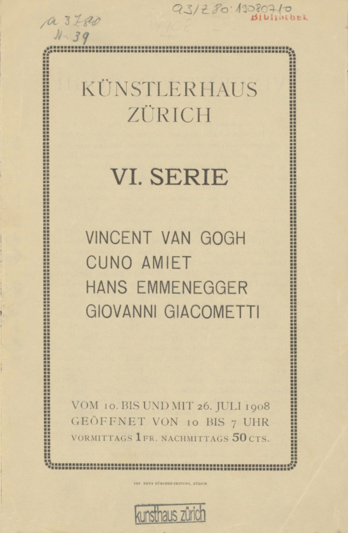 Vincent van Gogh, Cuno Amiet, Hans Emmenegger, Giovanni Giacometti : VI. Serie : vom 10. bis und mit 26. Juli 1908
